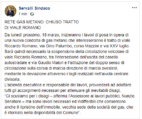 Questo il post pubblicato sulla pagina fb ufficiale del Sindaco di Cava de' Tirreni Servalli.