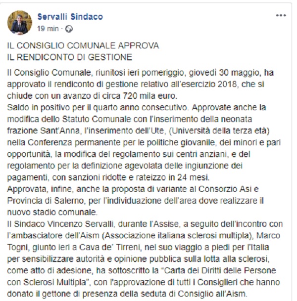 Questo il post pubblicato sulla pagin fb ufficiale del Sindaco di Cava de' Tirreni Servalli.