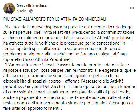 Questo il post pubblicato sulla sua Pagina Facebook dal Sindaco di Cava de' Tirreni Vincenzo Servalli: "Più spazi all'aperto per le attività commerciali. Alla luce delle nuove disposizioni previste dal recente decreto legge sulle riaperture, che limita le attività precludendo la somministrazione al chiuso di alimenti e bevande - si legge nel post - l’Assessorato alle Attività produttive ha attivato tutte le verifiche e le procedure per la concessione, in tempi rapidi di spazi all’aperto, in via provvisoria e in deroga al regolamento vigente, alle attività che ne faranno richiesta al Suap (Sportello Unico Attività Produttive). “L’Amministrazione Servalli è assolutamente pronta a dare tutte le risposte e soluzioni possibili per venire incontro alle esigenze di quelle attività - prosegue il post - di ristorazione che sono svantaggiate rispetto a chi ha disponibilità di spazi all’aperto – afferma l’Assessore alle Attività produttive, Giovanni Del Vecchio – stiamo operando anche in funzione di concessioni di spazi attualmente occupati da stalli di parcheggio, anche a pagamento, e che siano strettamente adiacenti alle attività, resta il nodo dell’attraversamento stradale per il quale - conclude il post - c’è bisogno di fare ulteriori approfondimenti”.