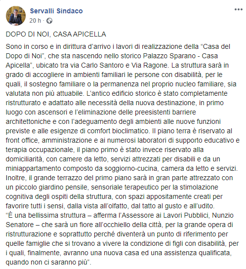 Questo il post pubblicato su Facebook dal Sindaco di Cava de' Tirreni Vincenzo Servalli: