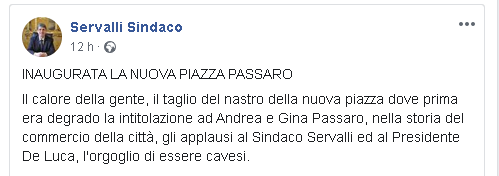 "INAUGURATA LA NUOVA PIAZZA PASSARO. Il calore della gente, il taglio del nastro della nuova piazza dove prima era degrado la intitolazione ad Andrea e Gina Passaro, nella storia del commercio della città, gli applausi al Sindaco Servalli ed al Presidente De Luca, l'orgoglio di essere cavesi."