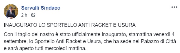 Questo quanto pubblicato sulla pagina facebook del Sindaco Servalli
