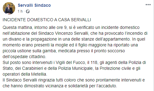 "Questa mattina, intorno alle ore 9, si è verificato un incidente domestico nell’abitazione del Sindaco Vincenzo Servalli, che ha provocato l’incendio di un divano e la propagazione in una delle stanze dell’appartamento. In quel momento erano presenti la moglie ed il figlio maggiore ha riportato una piccola ustione sulla gamba, medicata presso il pronto soccorso dell’ospedale cittadino.