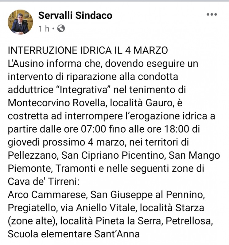 Lo apprendiamo dalla pagina Facebook del Sindaco di Cava de' Tirreni, Vincenzo Servalli: