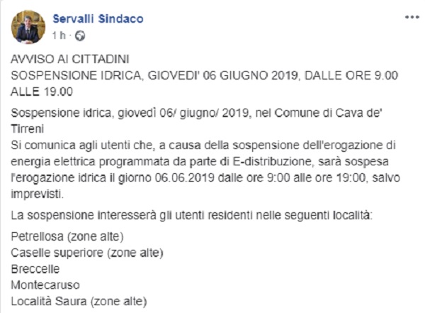 Questo il post pubblicato sulla pagina fb ufficiale del Sindaco di Cava de' Tirreni Servalli.
