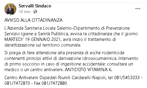 Lo apprendiamo dalla pagina Facebook del Sindaco di Cava de' Tirreni, Vincenzo Servalli.