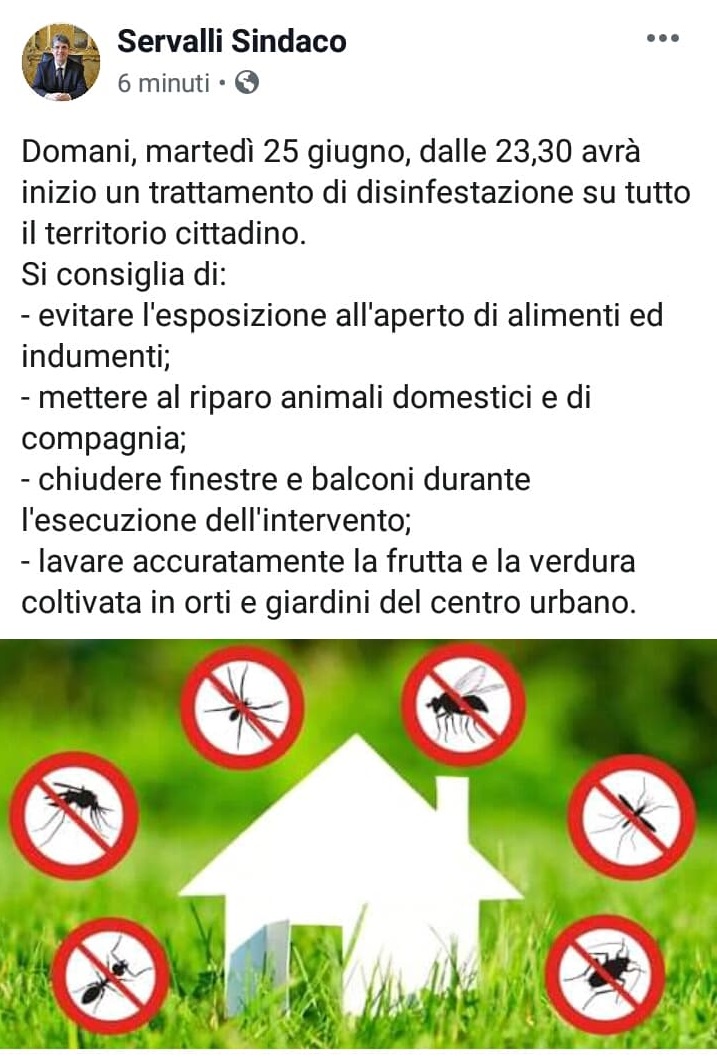 Questo quanto apprendiamo dal Sindaco di Cava de' Tirreni in merito alle operazioni di disinfestazione.
