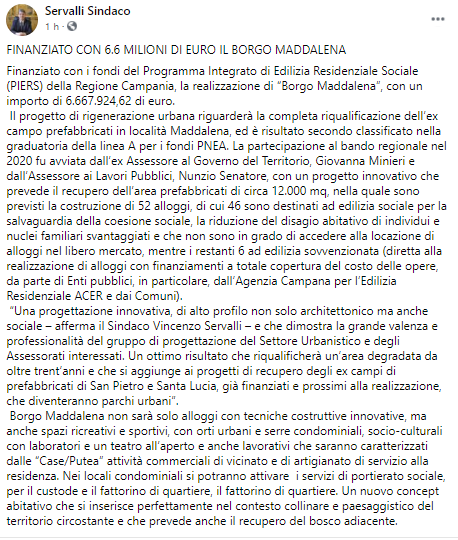 Questo il post pubblicato dal Sindaco di Cava de Tirreni Vincenzo Servalli sulla sua pagina Facebok: "Finanziato con 6.6 milioni di euro il Borgo Maddalena. Finanziato con i fondi del Programma Integrato di Edilizia Residenziale Sociale (PIERS) della Regione Campania, la realizzazione di “Borgo Maddalena”, con un importo di 6.667.924,62 di euro. Il progetto di rigenerazione urbana - si legge nel post - riguarderà la completa riqualificazione dell’ex campo prefabbricati in località Maddalena, ed è risultato secondo classificato nella graduatoria della linea A per i fondi PNEA. La partecipazione al bando regionale nel 2020 fu avviata dall’ex Assessore al Governo del Territorio, Giovanna Minieri e dall’Assessore ai Lavori Pubblici, Nunzio Senatore, con un progetto innovativo - si legge ancora - che prevede il recupero dell’area prefabbricati di circa 12.000 mq, nella quale sono previsti la costruzione di 52 alloggi, di cui 46 sono destinati ad edilizia sociale per la salvaguardia della coesione sociale, la riduzione del disagio abitativo di individui e nuclei familiari svantaggiati e che non sono in grado di accedere alla locazione di alloggi nel libero mercato, mentre - prosegue il post - i restanti 6 ad edilizia sovvenzionata (diretta alla realizzazione di alloggi con finanziamenti a totale copertura del costo delle opere, da parte di Enti pubblici, in particolare, dall’Agenzia Campana per l’Edilizia Residenziale ACER e dai Comuni). “Una progettazione innovativa, di alto profilo non solo architettonico ma anche sociale – afferma il Sindaco Vincenzo Servalli – e che dimostra la grande valenza e professionalità del gruppo di progettazione del Settore Urbanistico e degli Assessorati interessati. Un ottimo risultato - prosegue il post - che riqualificherà un’area degradata da oltre trent’anni e che si aggiunge ai progetti di recupero degli ex campi di prefabbricati di San Pietro e Santa Lucia, già finanziati e prossimi alla realizzazione, che diventeranno parchi urbani”. Borgo Maddalena non sarà solo alloggi con tecniche costruttive innovative, ma anche - si legge ancora - spazi ricreativi e sportivi, con orti urbani e serre condominiali, socio-culturali con laboratori e un teatro all’aperto e anche lavorativi che saranno caratterizzati dalle “Case/Putea” attività commerciali di vicinato e di artigianato di servizio alla residenza. Nei locali condominiali si potranno attivare i servizi di portierato sociale, per il custode e il fattorino di quartiere, il fattorino di quartiere. Un nuovo concept abitativo - conclude il post - che si inserisce perfettamente nel contesto collinare e paesaggistico del territorio circostante e che prevede anche il recupero del bosco adiacente".