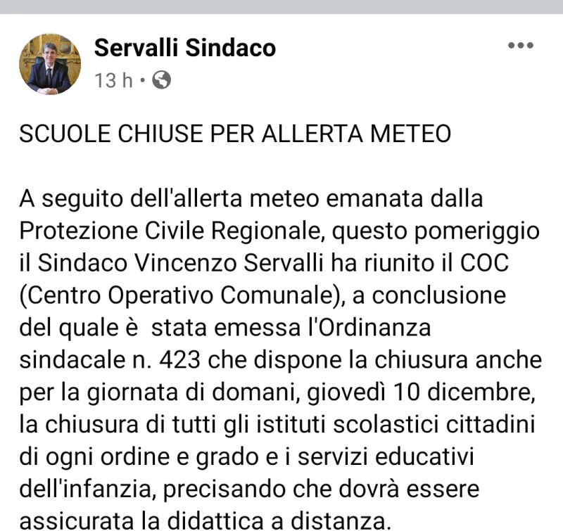 Lo apprendiamo dalla pagina Facebook del Sindaco di Cava de' Tirreni, Servalli.