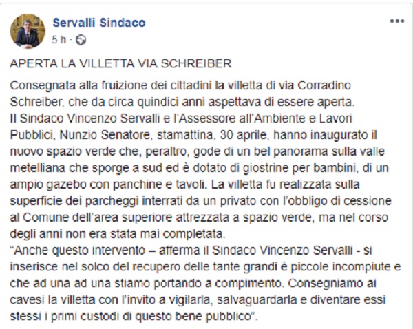Questo il post pubblicato sulla pagina fb ufficiale del Sindaco di Cava de' Tirreni Servalli.