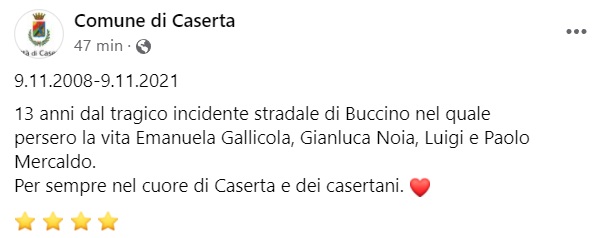 "9.11.2008-9.11.2021 13 anni dal tragico incidente stradale di Buccino nel quale persero la vita Emanuela Gallicola, Gianluca Noia, Luigi e Paolo Mercaldo. -Si legge nella nota- Per sempre nel cuore di Caserta e dei casertani."