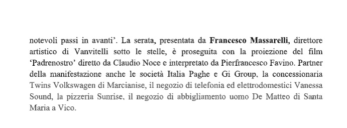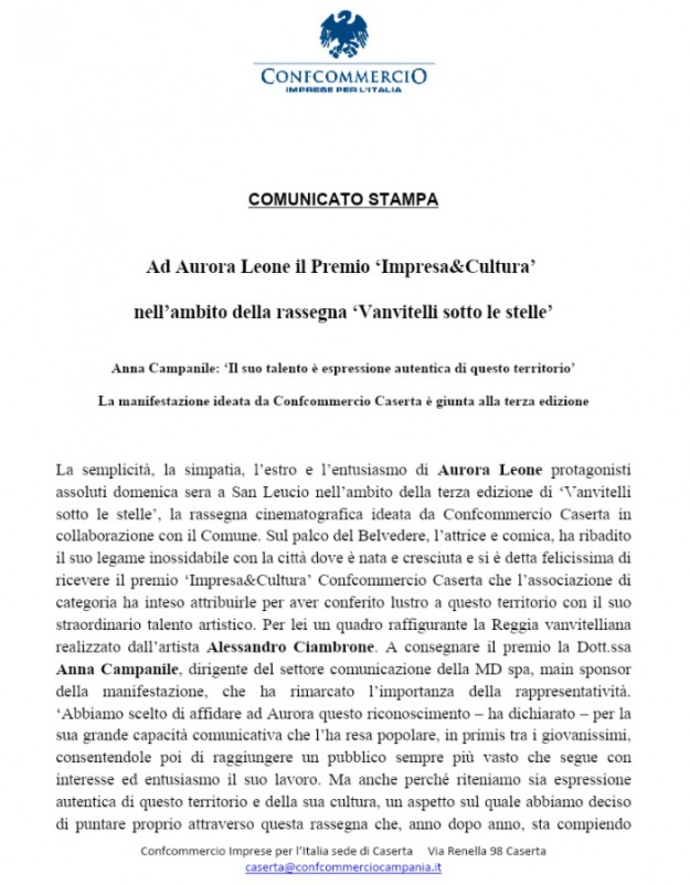 "Ad Aurora Leone il Premio ‘Impresa&Cultura’ nell’ambito della rassegna ‘Vanvitelli sotto le stelle’. Anna Campanile: ‘Il suo talento è espressione autentica di questo territorio’. La manifestazione ideata da Confcommercio Caserta è giunta alla terza edizione. La semplicità, la simpatia, l’estro e l’entusiasmo di Aurora Leone protagonisti assoluti- si legge nella nota- domenica sera a San Leucio nell’ambito della terza edizione di ‘Vanvitelli sotto le stelle’, la rassegna cinematografica ideata da Confcommercio Caserta in collaborazione con il Comune. Sul palco del Belvedere, l’attrice e comica, ha ribadito il suo legame inossidabile con la città dove è nata e cresciuta e si è detta felicissima di ricevere il premio ‘Impresa&Cultura’ Confcommercio Caserta che l’associazione di categoria ha inteso attribuirle per aver conferito lustro a questo territorio con il suo straordinario talento artistico. Per lei un quadro raffigurante la Reggia vanvitelliana realizzato dall’artista Alessandro Ciambrone. A consegnare il premio la Dott.ssa Anna Campanile, dirigente del settore comunicazione della MD spa, main sponsor della manifestazione, che ha rimarcato l’importanza della rappresentatività. ‘Abbiamo scelto di affidare ad Aurora questo riconoscimento – ha dichiarato – per la sua grande capacità comunicativa che l’ha resa popolare, in primis tra i giovanissimi, consentendole poi di raggiungere un pubblico sempre più vasto che segue con interesse ed entusiasmo il suo lavoro. Ma anche perché riteniamo sia espressione autentica di questo territorio e della sua cultura, un aspetto sul quale abbiamo deciso di puntare proprio attraverso questa rassegna che, anno dopo anno, sta compiendo notevoli passi in avanti’. La serata, presentata da Francesco Massarelli, direttore artistico di Vanvitelli sotto le stelle, è proseguita- si legge nella nota- con la proiezione del film ‘Padrenostro’ diretto da Claudio Noce e interpretato da Pierfrancesco Favino. Partner della manifestazione anche le società Italia Paghe e Gi Group, la concessionaria Twins Volkswagen di Marcianise, il negozio di telefonia ed elettrodomestici Vanessa Sound, la pizzeria Sunrise, il negozio di abbigliamento uomo De Matteo di Santa Maria a Vico."