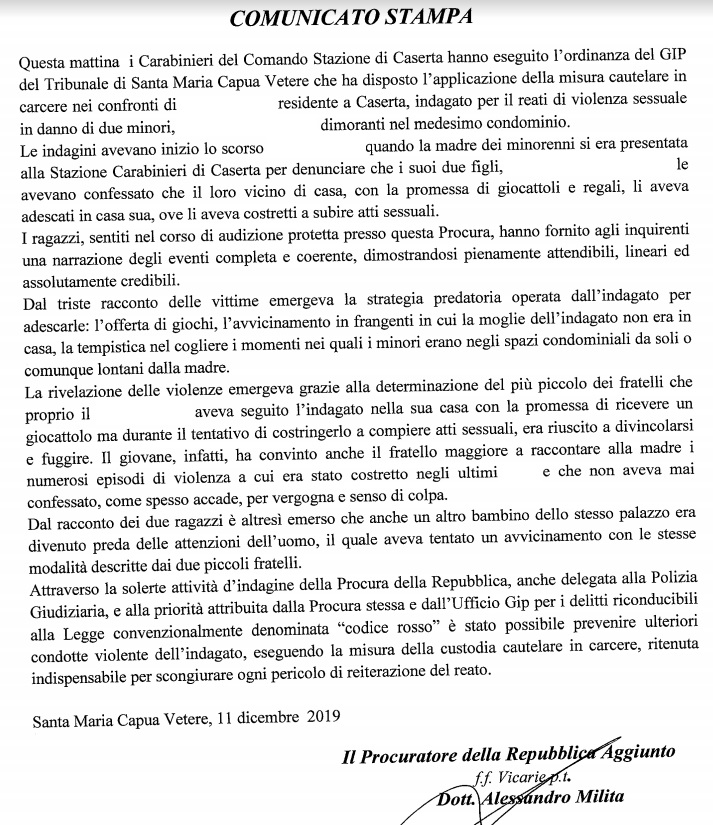 Pubblichiamo nota stampa della Procura di SMCV