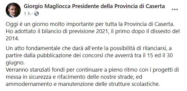 "Oggi è un giorno molto importante per tutta la Provincia di Caserta. Ho adottato il bilancio di previsione 2021, il primo dopo il dissesto del 2014. Un atto fondamentale che darà all'ente la possibilità di rilanciarsi, a partire dalla pubblicazione dei concorsi che avverrà tra il 15 ed il 30 giugno. -Si legge nella nota- Verranno stanziati fondi per continuare a pieno ritmo con i progetti di messa in sicurezza e rifacimento delle nostre strade, ed ammodernamento e manutenzione delle strutture scolastiche."