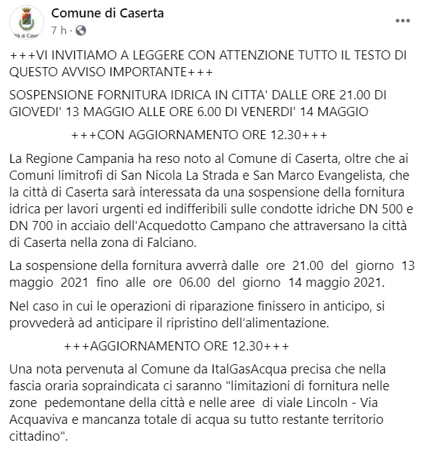 Questo quanto pubblicato sulla pagina fb del Comune di Caserta: "VI INVITIAMO A LEGGERE CON ATTENZIONE TUTTO IL TESTO DI QUESTO AVVISO IMPORTANTE+++ SOSPENSIONE FORNITURA IDRICA IN CITTA' DALLE ORE 21.00 DI GIOVEDI' 13 MAGGIO ALLE ORE 6.00 DI VENERDI' 14 MAGGIO +++CON AGGIORNAMENTO ORE 12.30+++ La Regione Campania ha reso noto al Comune di Caserta, oltre che ai Comuni limitrofi di San Nicola La Strada e San Marco Evangelista, che la città di Caserta sarà interessata da una sospensione della fornitura idrica per lavori urgenti ed indifferibili sulle condotte idriche DN 500 e DN 700 in acciaio dell'Acquedotto Campano che attraversano la città di Caserta nella zona di Falciano. La sospensione della fornitura avverrà dalle ore 21.00 del giorno 13 maggio 2021 fino alle ore 06.00 del giorno 14 maggio 2021. Nel caso in cui le operazioni di riparazione finissero in anticipo, si provvederà ad anticipare il ripristino dell’alimentazione. +++AGGIORNAMENTO ORE 12.30+++ Una nota pervenuta al Comune da ItalGasAcqua precisa che nella fascia oraria sopraindicata ci saranno "limitazioni di fornitura nelle zone pedemontane della città e nelle aree di viale Lincoln - Via Acquaviva e mancanza totale di acqua su tutto restante territorio cittadino"."