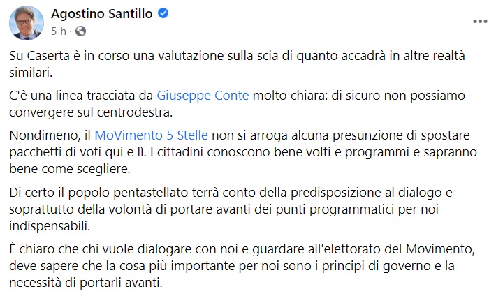 Questo quanto apprendiamo dalla pagina fb del Senatore Santillo: "Su Caserta è in corso una valutazione sulla scia di quanto accadrà in altre realtà similari. C'è una linea tracciata da Giuseppe Conte molto chiara - si legge nella nota -: di sicuro non possiamo convergere sul centrodestra. Nondimeno, il MoVimento 5 Stelle non si arroga alcuna presunzione di spostare pacchetti di voti qui e lì. I cittadini conoscono bene volti e programmi e sapranno bene come scegliere. Di certo il popolo pentastellato terrà conto della predisposizione al dialogo e soprattutto della volontà di portare avanti dei punti programmatici per noi indispensabili. È chiaro che chi vuole dialogare con noi - si legge nella nota - e guardare all'elettorato del Movimento, deve sapere che la cosa più importante per noi sono i principi di governo e la necessità di portarli avanti."