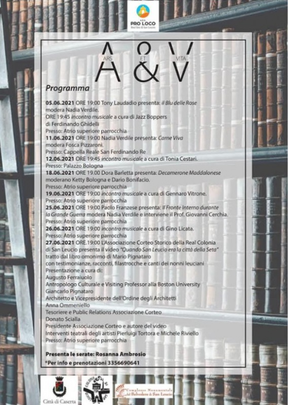 Pubblichiamo COMUNICATO STAMPA Aps Pro Loco Real Sito di San Leucio: "Ars et Vita è l’iniziativa della Pro Loco Real Sito San Leucio, guidata da Domenico Villano, che segna la ripartenza, in presenza, delle attività culturali nel borgo borbonico per eccellenza. «Tutto nasce da un'idea di Marta Campanile – spiega Villano – quando iniziammo, durante gli scorsi mesi, con il ciclo Incontri con l'autore e dall’iniziativa di Ferdinando Ghidelli chiamata Maggio musicale. La pandemia pensava di fermarci ma noi abbiamo accorpato le due idee e così è nato il cartellone Ars et Vita. Sentivamo forte - si legge nella nota -, tutti, il bisogno di ricominciare, avevamo il mai sopito desiderio di tornare in presenza, guardarci negli occhi, ascoltarci dal vico. Così, con tutte le precauzioni, nel rispetto della normativa vigente, abbiamo messo su, con un parterre qualificato di sponsor, un cartellone che ci piace molto e ci fa sentire la gioia della ripartenza». Queste le date e gli ospiti del giugno leuciano: si comincia venerdì 4, alle 19, con due incontri dedicati a giovani autrici. Arianna Melone presenterà il suo “Gianna”, interverrà Nadia Ersilia Atzori e a seguire ci sarà Antonietta D’Oria con il suo “Lo sguardo altrove”, gli incontri saranno moderati da Marta Campanile; il 5 Tony Laudadio presenta il suo romanzo “Il Blu delle Rose” - si legge nella nota - in dialogo con Nadia Verdile. A seguire incontro musicale a cura di Jazz Boppers di Ferdinando Ghidelli. I due appuntamenti di questo weekend saranno nell’Atrio Superiore Parrocchia al Belvedere. Venerdì 11, alle 19, presentazione del libro “Carne viva. Una saga italiana tra Otto e Novecento” di Nadia Verdile. Con l’autrice dialogherà Fosca Pizzaroni. L’incontro nella Cappella Reale San Ferdinando Re. Sabato 12, alle 19, a Palazzo Bologna, l’incontro musicale con Tonia Cestari. Il 18, alle 19, Atrio Superiore Parrocchia, Belvedere di San Leucio, sarà la volta di Dora Barletta e il suo Decamerone maddalonese, moderano Ketty Bologna e Dario Bonifacio. Il 19, alle 20, Atrio Superiore Parrocchia, incontro musicale a cura di Gennaro Vitrone. Venerdì 25, alle 19, Atrio Superiore Parrocchia, Gianni Cerchia presenta il libro di Paolo Franzese “Il fronte interno durante la grande guerra”, l’incontro - si legge nella nota - sarà moderato da Nadia Verdile. Sabato 26, alle 20, momento musicale a cura di Gino Licata, nell’Atrio Superiore Parrocchia. Domenica 27, alle 19, “Quando San Leucio era la Città della Seta” a cura dell’Associazione Corteo della Real Colonia di San Leucio, tratto dall’omonimo libro di Mario Pignataro. Interverranno Augusto Ferraiuolo, Giancarlo Pignataro, Anna Ommeniello, Donato Scialla. Interventi teatrali di Pierluigi Tortora e Michele Riviello. Informazioni e prenotazioni al numero 3356690641. Tutti gli incontri sono gratuiti. «Sento – conclude Domenico Villano – il dovere di ringraziare tutti coloro che in questi giorni stanno lavorando per la buona riuscita degli eventi, l’amministrazione comunale che ci ha messo a disposizione spazi all’interno del Belvedere e don Battista Marello per la sua preziosa collaborazione e per aver messo a disposizione la Cappella Reale San Ferdinando Re - si legge nella nota - per la presentazione del libro di Nadia Verdile. La nostra forza è la sinergia, la condivisione, la voglia comune di rendere omaggio a uno dei luoghi più belli del territorio»."