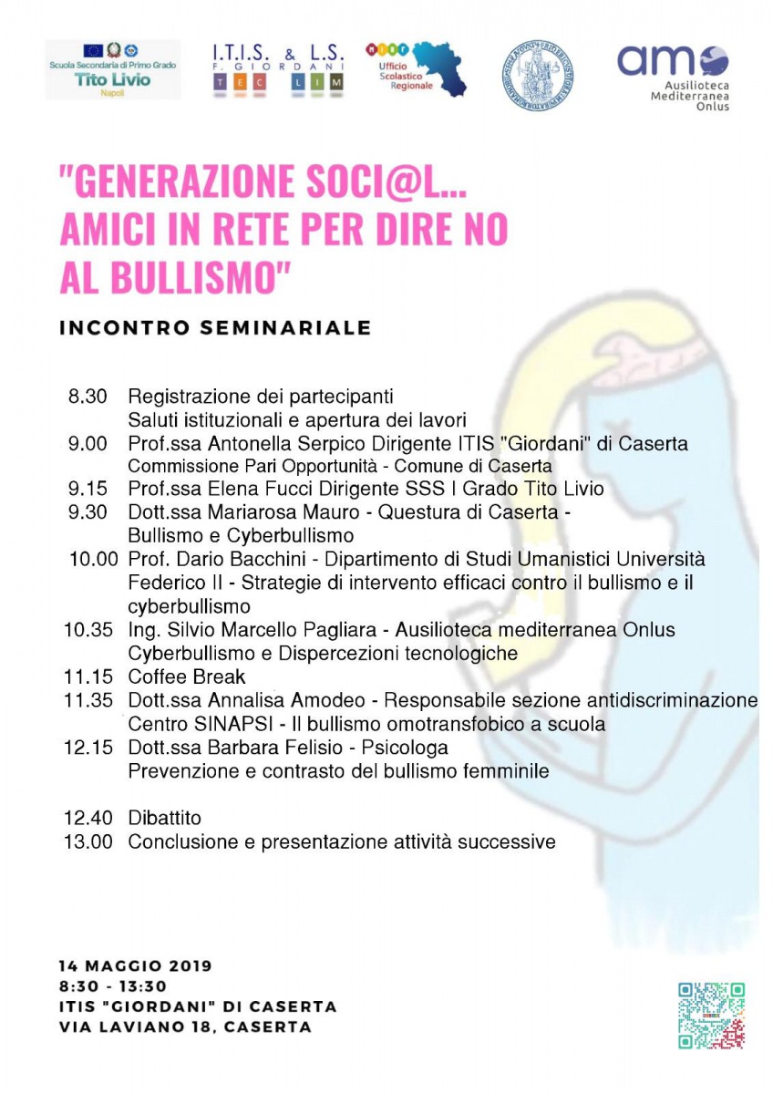Rivolto a tutti i referenti per il contrasto al bullismo delle Scuole della Provincia di Caserta . Il programma è veramente ricco ed interessante . Sarà presente per un saluto la referente dell’ufficio Scolastico Regionale dott ssa Marina de Blasio ."