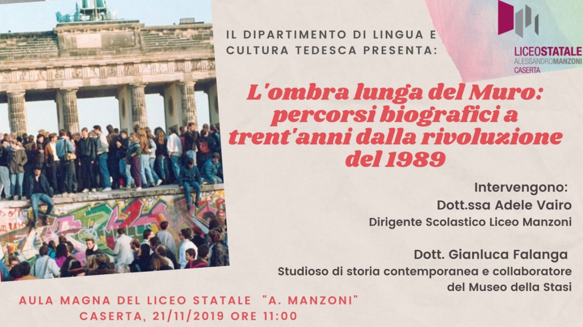 Domani, giovedì 21 novembre, si terrà presso l'Aula Magna del Liceo Statale "A.Manzoni" di Caserta l'incontro "L'ombra lunga del Muro: percorsi biografici a trent'anni dalla rivoluzione del 1989". L'evento si terrà alle ore 11, e interverrano il dirigente scolastico, Adele Vairo, e Gianluca Falanga, studioso di storia contemporanea e collaboratore del Museo della Stasi.