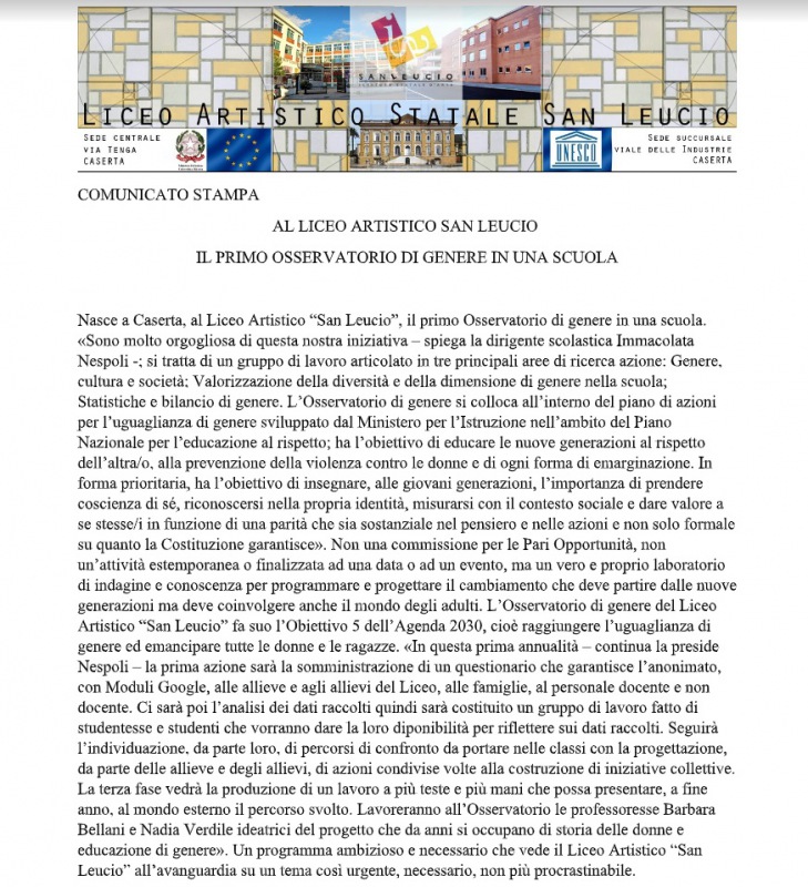 "AL LICEO ARTISTICO SAN LEUCIO IL PRIMO OSSERVATORIO DI GENERE IN UNA SCUOLA. Nasce a Caserta, al Liceo Artistico “San Leucio”, il primo Osservatorio di genere in una scuola. «Sono molto orgogliosa di questa nostra iniziativa – spiega la dirigente scolastica Immacolata Nespoli -; si tratta - si legge nelle nota- di un gruppo di lavoro articolato in tre principali aree di ricerca azione: Genere, cultura e società; Valorizzazione della diversità e della dimensione di genere nella scuola; Statistiche e bilancio di genere. L’Osservatorio di genere si colloca all’interno del piano di azioni per l’uguaglianza di genere sviluppato dal Ministero per l’Istruzione nell’ambito del Piano Nazionale per l’educazione al rispetto; ha l’obiettivo di educare le nuove generazioni al rispetto dell’altra/o, alla prevenzione della violenza contro le donne e di ogni forma di emarginazione. In forma prioritaria, ha l’obiettivo di insegnare, alle giovani generazioni, l’importanza di prendere coscienza di sé, riconoscersi nella propria identità, misurarsi con il contesto sociale e dare valore a se stesse/i in funzione di una parità che sia sostanziale nel pensiero e nelle azioni e non solo formale su quanto la Costituzione garantisce». Non una commissione per le Pari Opportunità, non un’attività estemporanea o finalizzata ad una data o ad un evento, ma un vero e proprio laboratorio di indagine e conoscenza per programmare e progettare il cambiamento che deve partire dalle nuove generazioni ma deve coinvolgere anche il mondo degli adulti. L’Osservatorio di genere del Liceo Artistico “San Leucio” fa suo l’Obiettivo 5 dell’Agenda 2030, cioè raggiungere l’uguaglianza di genere ed emancipare tutte le donne e le ragazze. «In questa prima annualità – continua la preside Nespoli – la prima azione sarà la somministrazione di un questionario che garantisce l’anonimato, con Moduli Google, alle allieve e agli allievi del Liceo, alle famiglie, al personale docente e non docente. Ci sarà poi l’analisi dei dati raccolti quindi sarà costituito un gruppo di lavoro fatto di studentesse e studenti che vorranno dare la loro diponibilità per riflettere sui dati raccolti. Seguirà l’individuazione, da parte loro, di percorsi di confronto da portare- si legge nella nota- nelle classi con la progettazione, da parte delle allieve e degli allievi, di azioni condivise volte alla costruzione di iniziative collettive. La terza fase vedrà la produzione di un lavoro a più teste e più mani che possa presentare, a fine anno, al mondo esterno il percorso svolto. Lavoreranno all’Osservatorio le professoresse Barbara Bellani e Nadia Verdile ideatrici del progetto che da anni si occupano di storia delle donne e educazione di genere». Un programma ambizioso e necessario che vede il Liceo Artistico “San Leucio” all’avanguardia su un tema così urgente, necessario, non più procrastinabile."