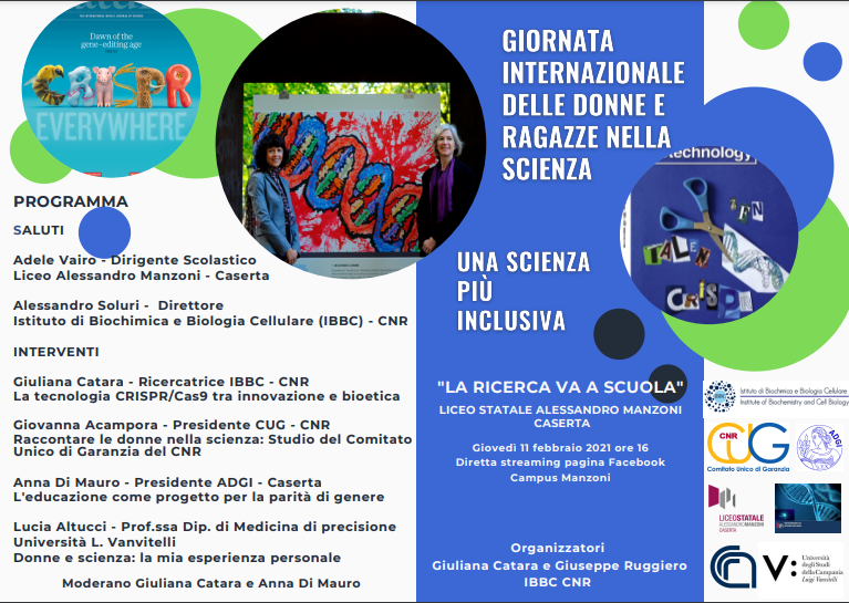 Proseguono, a pieno ritmo, gli eventi live sulla pagina Facebook “Campus Manzoni”, grande occasione di riflessione ed approfondimento in merito a tematiche culturali e di attualità. -spiega la nota-“Una Scienza più inclusiva” è il tema che verrà affrontato alle ore 16.00 di giovedì 11 febbraio dagli studenti e dal corpo docente del Liceo Statale “A. Manzoni di Caserta" – diretto dalla dott.ssa Adele Vairo -, nell’ambito della " Giornata Internazionale delle donne e ragazze nella Scienza." L’incontro – che fa parte del ciclo “La ricerca va a scuola” a cura di Ibbc-CNR, con il contributo di Associazione Donne Giuriste Italiane (ADGI) – Caserta, intende promuovere la cultura della complementarietà e-si legge nella nota- della collaborazione, ponendo l’accento sul ruolo chiave che le donne giocano nello sviluppo della scienza e della tecnologia. La narrazione di “fatti” di scienza prenderà in considerazione la dirompente CRISPR/Cas9, i racconti dell’esperienza delle scienziate a Napoli fra il 1870 e 1945 a cura del CUG-CNR. -spiega la nota-Di poi, l'ADGI proporrà una riflessione sulla educazione come strumento progettuale, finalizzato alla parità di genere. Il momento seminariale si concluderà con uno sguardo proiettato al futuro, grazie alla prestigiosa testimonianza di ricerca al femminile “made in Naples”, al fine di favorire fra i giovani la consapevolezza e la fiducia nel ruolo della scienza nella società del Meridione.-spiega la nota-L’evento sarà aperto dal D.S. del Campus Manzoni, Adele Vairo e di Alessandro Soluri, Direttore Istituto di Biochimica e Biologia Cellulare (IBBC)- CNR. Numerosi gli interventi, che animeranno l'incontro: Giuliana Catara - Ricercatrice IBBC-CNR, Giovanna Acampora-Presidente CUG-CNR, Anna Di Mauro – Presidente ADGI – Caserta, Lucia Altucci – Prof.ssa Dip.-spiega la nota- Di Medicina di precisione Università L. Vanvitelli. Un nutrito programma, un parterre di grandi esperti, un evento di grande spessore per l'Istituto ed il territorio tutto."