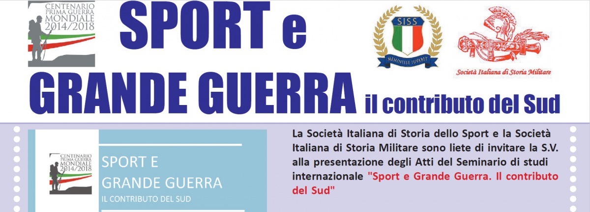 Il 20 novembre 2019 alle ore 11,00 presso l’Aula Magna del Liceo “A. Manzoni” Via Alcide De Gasperi - Caserta vi sarà la presentazione del libro "Sport e Grande Guerra. Il contributo del Sud" edito dalla Società Italiana di Storia dello Sport e dalla Società Italiana di Storia Militare. Saluti di Adele Vairo (Dirigente scolastica) e Giorgio Magliocca (Presidente della Provincia di Caserta), Carlo Marino (Sindaco di Caserta), Bruno Giannico (Presidente del Rotary Club “Luigi Vanvitelli”). Intervengono: Fulvio Poli (Gen. B. Capo V Reparto Affari Generali S.M. Esercito), Rocco Galasso (Consigliere nazionale Istituto Nastro Azzurro), Raffaele Ciccarelli (Delegato regionale Siss), Angela Teja, Donato Tamblé e Luciano De Luca, curatori del volume. "Questo volume raccoglie gli Atti del Seminario Internazionale che si è svolto a Caserta nel 2017, un prolungamento della ricerca sullo Sport e la Grande Guerra iniziato dalla Siss nel 2014, con l'aggiunta di una variabile: quella del Sud. Un testo che evidenzia - si legge nella nota - una stretta collaborazione tra gli studi di storia militare e quelli di storia dello sport, ricco di novità storiografiche e di proposte di ricerca sull'origine dello sport al Sud e sulla necessità di tutela degli archivi. Il volume presenta materiale di studio utile ai giovani studenti, perché abbiano una maggiore consapevolezza sempre più approfondita sullo sport, valido strumento di crescita culturale e di pace tra i popoli."