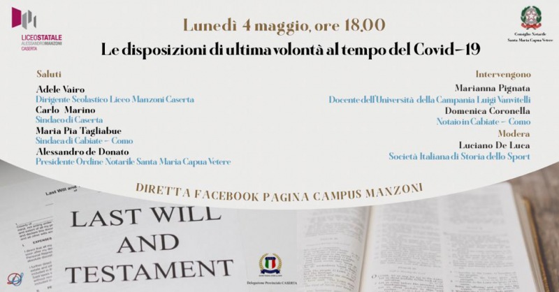 Pubblichiamo Comunicato Stampa SISS: "Al Manzoni si parla di Disposizioni Successorie Il liceo Manzoni di Caserta, diretto dalla Dirigente Scolastica Dott.ssa Adele Vairo, ha organizzato in sinergia con il Dipartimento di Diritto coordinato dalla Prof.ssa Marilina Pugliese e con la collaborazione del Dipartimento di Scienze Motorie e Sportive coordinato dal Prof. Antimo Nero, un seminario - si legge nella nota - in modalità streaming, dal titolo: Le Disposizioni di ultima volontà al tempo del Covid-19, che sarà trasmesso in diretta lunedì 04 maggio alle ore 18.00 sulla pagina Facebook Campus Manzoni. Si parlerà di Disposizioni Successorie per chiarire dubbi di comune portata e promuovere la conoscenza del Diritto tra i giovani. Il seminario vedrà protagoniste le donne. Oltre le relatrici tutte donne, si discuterà della prima donna Notaio, quale espressione di eccellenza professionale. Si argomenterà, inoltre, di come lo sport possa essere il motivo pulsante di una disposizione di ultime volontà testamentaria e come questa possa attuarsi nel concreto studiando le leggi che regolano la successione dei fondi e degli archivi sportivi. I lavori prenderanno l’avvio con i saluti istituzionali della Preside Vairo e del Dott. Carlo Marino - si legge nella nota - Sindaco di Caserta e del Dott. Alessandro de Donato Notaio e Presidente del Consiglio Notarile di Santa Maria Capua Vetere. Sarà in collegamento da Cabiate (Co) la Sindaca Dott. ssa Maria Pia Tagliabue, alla quale saranno espressi vicinanza e solidarietà ai territori lombardi che sono stati maggiormente colpiti dalla pandemia. Interverranno in qualità di relatori la Dott.ssa Domenica Coronella Notaio in Cabiate (Co) e la Prof.ssa Marianna Pignata Docente di Storia del Diritto Medievale e Moderno dell’Università della Campania Luigi Vanvitelli. A moderare l’incontro sarà il Prof. Luciano De Luca Delegato della Società Italiana di Storia dello Sport di Caserta (Siss). Il seminario ha ottenuto il patrocinio del Consiglio Notarile di Santa Maria Capua Vetere e della Società Italiana di Storia dello Sport. L’evento sarà una grande opportunità per gli studenti “manzoniani” desiderosi di interagire - si legge nella nota -, con domande, commenti e riflessioni su un argomento di estrema attualità visto il momento complesso che stiamo vivendo, con lo scopo di proseguire con serenità il loro percorso di apprendimento e di sviluppo delle competenze con sinergia e ottimismo."