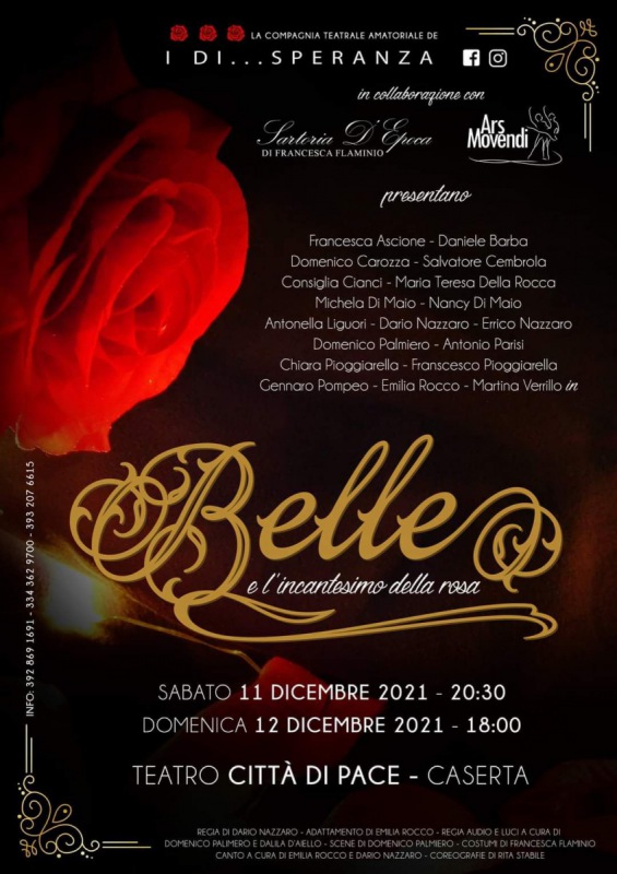 Pubblichiamo questo comunicato stampa: "La compagnia teatrale amatoriale “I Di… Speranza”, in collaborazione con Ars Movendi e Sartoria d’Epoca di Francesca Flaminio, sabato 11 dicembre alle ore 20,30 al Teatro Città di Pace di Caserta - si legge nella nota - rappresentano “Belle e l’incatesimo della rosa”. Lo spettacolo sarà replicato domenica 12 dicembre alle ore 18,00. Per info e prenotazioni 3925065259."