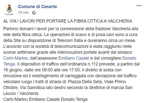 Questo quanto pubblicato sulla pagina facebook del Comune di Caserta: