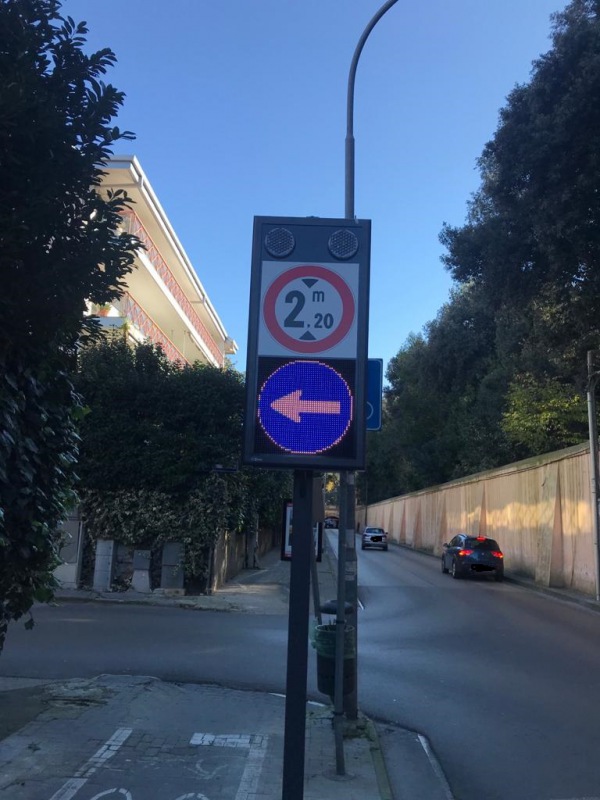 un’ efficace comunicazione agli utenti intimando obblighi di direzione qualora l’altezza del veicolo superi i metri 2,20. In particolare il sistema è composto da due sensori di rilevamento dell’altezza dei veicoli, collegati ad un apparato di segnaletica ad alta luminosità (led), posti rispettivamente poco prima dell’intersezione Via Camusso/Via S. Francesco d’Assisi, per i veicoli circolanti in via Camusso e poco prima dell’intersezione Via Sardegna/Via Santorio, per i veicoli circolanti in Via Sardegna. Il segnale integrato, avente dimensioni cm 160x75x15 e posizionato ad altezza di cm 220 da terra, è composto da: - Pittogramma raffigurante un divieto di transito per veicoli superiori a mt 2,20 di diametro 60 cm (articolo 118 cds – figura II 66); - Pittogramma raffigurante un obbligo di svolta a sinistra di diametro 60 cm (articolo 122 cds – figura II 80/b); - Duplice lampeggiante Ø 200, LED posto sulla parte superiore del display.