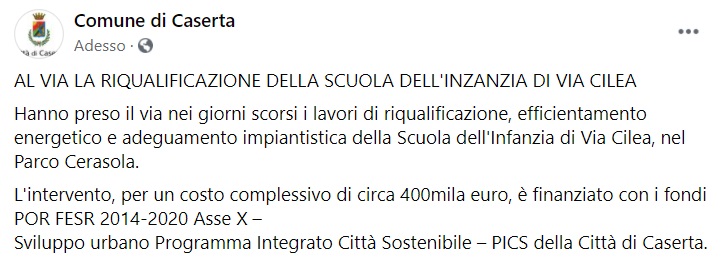 "AL VIA LA RIQUALIFICAZIONE DELLA SCUOLA DELL'INZANZIA DI VIA CILEA. Hanno preso il via nei giorni scorsi i lavori di riqualificazione, efficientamento energetico e adeguamento impiantistica della Scuola dell'Infanzia di Via Cilea, nel Parco Cerasola. L'intervento, per un costo complessivo di circa 400mila euro, è finanziato- si legge nella nota- con i fondi POR FESR 2014-2020 Asse X – Sviluppo urbano Programma Integrato Città Sostenibile – PICS della Città di Caserta"