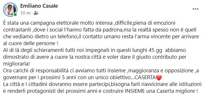 Questo quanto pubblicato sulla pagina fb del già Assessore Emiliano Casale: "È stata una campagna elettorale molto intensa, difficile, piena di emozioni contrastanti, dove i social l’hanno fatta da padrona, ma la realtà spesso non è quella che vediamo dietro un telefono - si legge nella nota -, il contatto umano resta l’arma vincente per arrivare al cuore delle persone! Al di là degli schieramenti tutti noi impegnati in questi lunghi 45 gg abbiamo dimostrato di avere a cuore la nostra città e voler dare il giusto contributo per migliorarla! Ora carichi di responsabilità ci avviamo tutti insieme, maggioranza e opposizione, a governare per i prossimi 5 anni con un unico obiettivo... CASERTA. La città e i cittadini dovranno essere partecipi - si legge nella nota -, bisogna farli riavvicinare alle istituzioni e renderli protagonisti dei prossimi anni e costruire INSIEME una Caserta migliore!".
