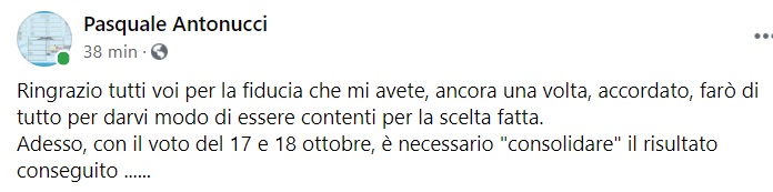 Questo quanto apprendiamo dalla pagina fb di Pasquale Antonucci: "Ringrazio tutti voi per la fiducia che mi avete, ancora una volta, accordato, farò di tutto per darvi modo di essere contenti per la scelta fatta. Adesso, con il voto del 17 e 18 ottobre, è necessario "consolidare" il risultato conseguito".