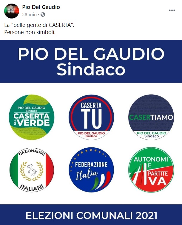 Sei liste ha di fatto presentato l'ex Sindaco di Caserta Pio Del Gaudio sulla sua pagina facebook. Ecco i loghi con rispettivi nomi dei partiti e movimenti che lo appoggeranno alle prossime comunali.