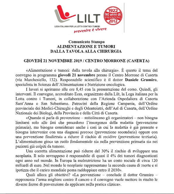 Di seguito, il testo del comunicato di «Alimentazione e tumori: dalla tavola alla chirurgia», giunto in redazione.