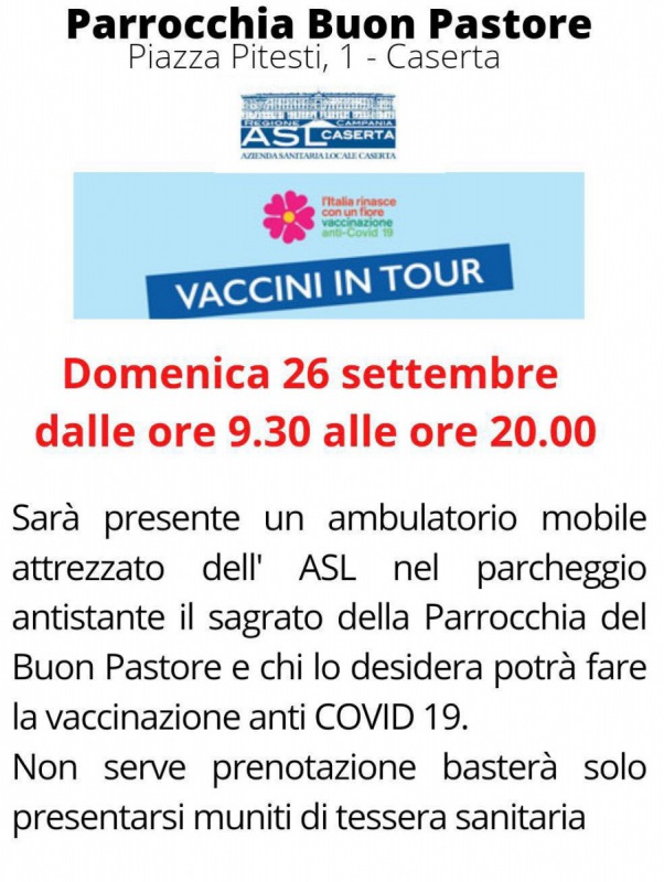 Presso la Parrocchia del Buon Pastore a Caserta arriva "Vaccini in tour", il camper messo a disposizione dell'Asl Caserta per le vaccinazioni. Queste saranno possibile presso il sagrato della chiesa domenica 26 settembre dalle ore 9:30 alle 20.