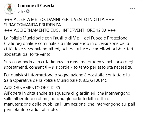 Lo apprendiamo dalla pagina facebook del Comune di Caserta.
