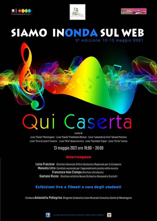 Oggi dalle ore 18.00 alle ore 20.00 alunni del Liceo Musicale dell’Istituto Terra di Lavoro saranno in onda sul web durante l’Evento “QUI CASERTA” a cura dei Licei Musicali della provincia di Caserta. All’evento - si legge nella nota - cui presenzieranno la dott.ssa Luisa Franzese, Direttore Generale dell’Ufficio Scolastico Regionale per la Campania, Manuela Litro del Comitato nazionale per l’approfondimento pratico della musica, Francesco Ivan Ciampa Direttore d’orchestra, Gaetano Russo Direttore artistico Nuova Orchestra Alessandro Scarlatti e condotto dal dirigente scolastico Antonietta Pellegrino del Liceo Musicale Coreutico Galilei di Mondragone, si esibiranno - si legge nella nota - i nostri allievi del liceo musicale cari alla preside Emilia Nocerino, Danilo Giaquinto (piano) della classe 4L, Guido Serra (violoncello) della classe 2L e Alessandra Rocco (marimba) della classe 5L che renderanno un piccolo omaggio a brani di Johann Sebastian Bach."