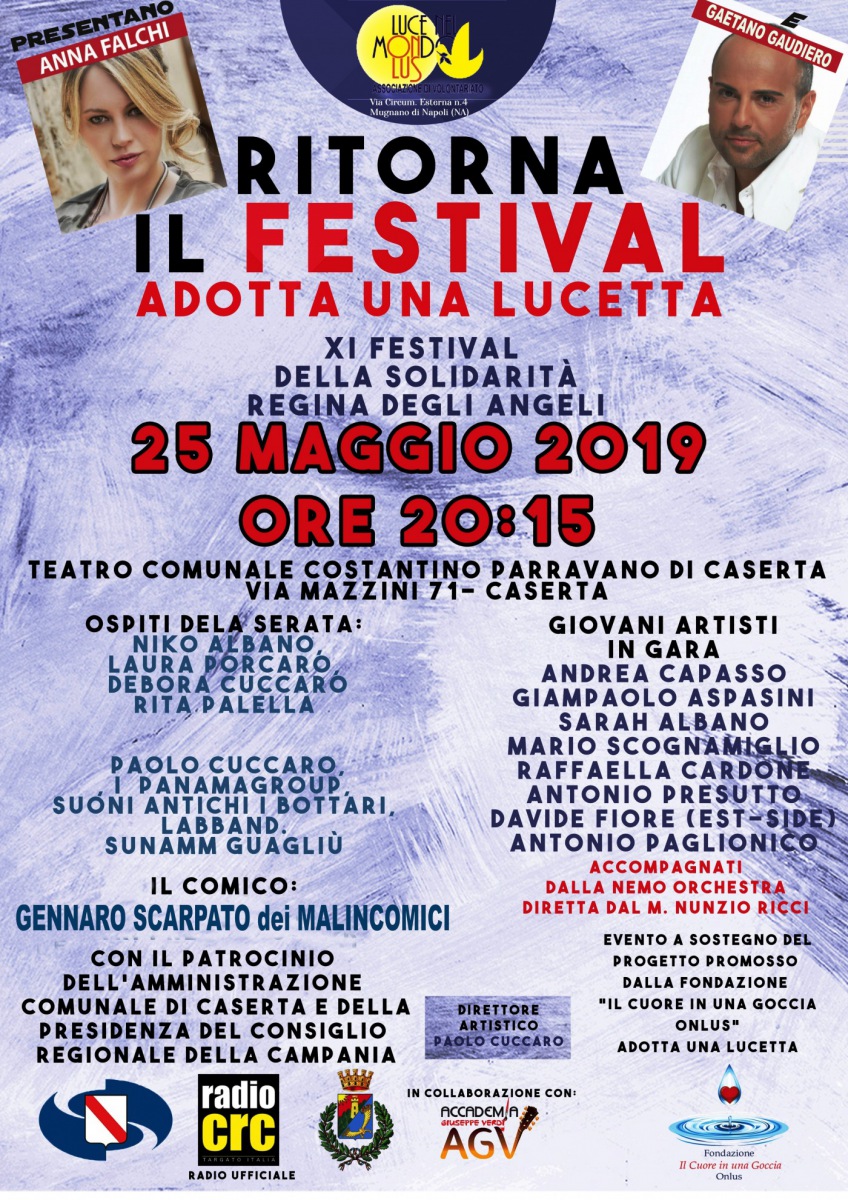 L’attrice e modella ha condiviso l’iniziativa benefica è sarà presente alla Kermesse canora E’ tutto pronto per dare inizio all’11^ edizione del Festival della Solidarietà “Regina degli Angeli” che, come di consuetudine , viene ospitato nella città di Caserta presso l’accogliente teatro”Costantino Parravano”. A condurre il Festival , grazie alla promozione e condivisione del progetto da parte di RADIO CRC TARGATO ITALIA , ci saranno Anna Falchi , attrice, modella e presentatrice di fama internazionale ed ora anche apprezzatissima conduttrice radiofonica e l’eclettico Gaetano Gaudiero, speaker di Radio CRC, attore, cantante, opinionista RAI, con la direzione artistica del cantautore Paolo Cuccaro. La manifestazione , organizzata dall’Associazione “Luce Nel Mondo ONLUS” , in favore del progetto “Adotta una Lucetta” promosso dalla Fondazione Il Cuore in una Goccia Onlus e finalizzato all'aiuto economico delle famiglie per la cura dei bambini affetti da patologie prenatali, è patrocinata dal Comune di Caserta e dalla Presidenza del Consiglio Regionale della Campania.