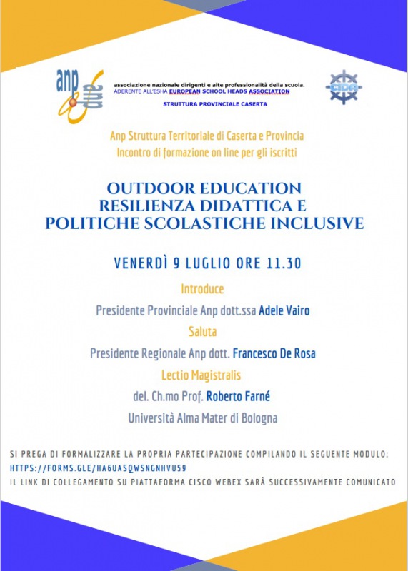 "L’Associazione nazionale presidi (ANP) Caserta, presieduto dalla D.S. Adele Vairo, propone ai propri associati un ulteriore appuntamento formativo relativo alle sempre più complesse sfide che la comunità scolastica deve quotidianamente affrontare. -Si legge nella nota- Il seminario online, previsto per venerdì 9 luglio alle ore 11,30, sarà introdotto dai saluti del Presidente provinciale, Dott.ssa Adele Vairo, e del Presidente regionale, Dott. Francesco De Rosa, che daranno il via alla lectio magistralis di Roberto Farnè, professore ordinario presso l’Università Alma Mater di Bologna e coordinatore del Corso di Laurea magistrale internazionale in Wellness Culture, nel dipartimento di Scienze per la Qualità della Vita. -Si legge nella nota- Il prestigioso appuntamento formativo prende spunto da uno degli ultimi lavori del Professore Farnè, autore del testo, Outdoor Education: prospettive teoriche e buone pratiche, che offre una varietà di quadri di ricerca, linee di intervento e suggestioni culturali a sostegno dell’ orientamento pedagogico e valorizza gli spazi esterni alle scuole, come ambienti di apprendimento e di benessere educativo. -Si legge nella nota- Tale innovativa prospettiva si inserisce nel percorso culturale intrapreso dall’Anp Caserta, volto a informare ed aggiornare la Dirigenza Scolastica ed il relativo Staff rispetto alle tematiche emergenti del mondo scolastico, come, in questo caso, le politiche inclusive, vero focus su cui è indispensabile riflettere nel contesto educativo contemporaneo postpandemico."