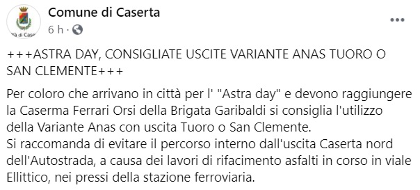 Questo quanto pubblicato sulla pagina fb del Comune di Caserta: "ASTRA DAY, CONSIGLIATE USCITE VARIANTE ANAS TUORO O SAN CLEMENTE Per coloro che arrivano in città per l' "Astra day" e devono raggiungere la Caserma Ferrari Orsi della Brigata Garibaldi si consiglia l'utilizzo - si legge nella nota - della Variante Anas con uscita Tuoro o San Clemente. Si raccomanda di evitare il percorso interno dall'uscita Caserta nord dell'Autostrada, a causa dei lavori di rifacimento asfalti in corso in viale Ellittico, nei pressi della stazione ferroviaria."