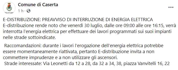 Questo quanto apprendiamo dalla pagina facebook del Comune di Caserta: