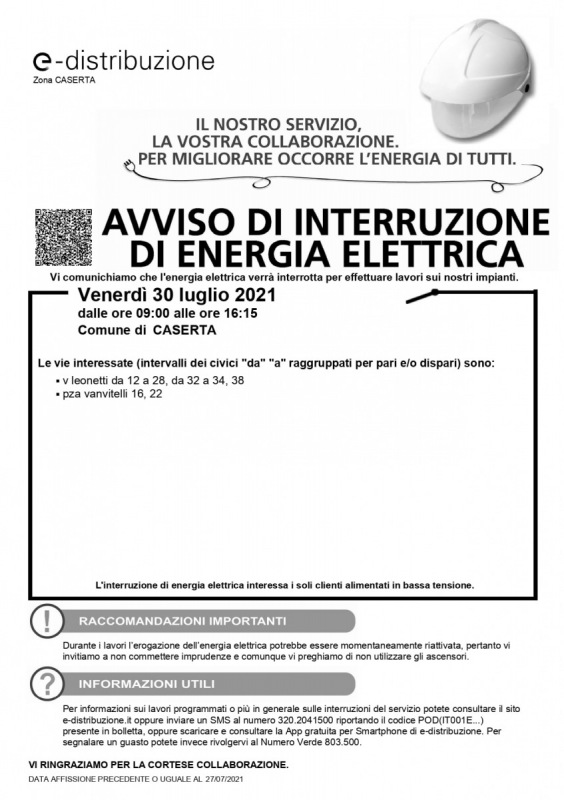 "E-DISTRIBUZIONE: PREAVVISO DI INTERRUZIONE DI ENERGIA ELETTRICA. E-distribuzione rende noto che venerdì 30 luglio, dalle ore 09:00 alle ore 16:15, verrà interrotta l’energia elettrica per effettuare dei lavori programmati sui suoi impianti nelle strade sottoindicate. Raccomandazioni: durante i lavori- si legge nella nota- l’erogazione dell’energia elettrica potrebbe essere momentaneamente riattivata, pertanto E-distribuzione invita a non commettere imprudenze e a non utilizzare gli ascensori. Strade interessate: Via Leonetti da 12 a 28, da 32 a 34, 38, piazza Vanvitelli 16, 22"