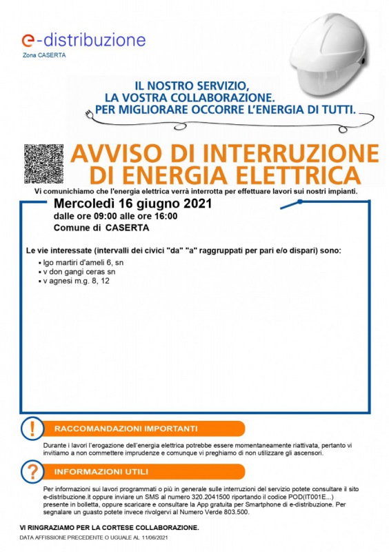 "MERCOLEDI' 16 GIUGNO, INTERRUZIONE FORNITURA ELETTRICA IN 3 STRADE DELLA CITTA' DALLE ORE 9.00 ALLE ORE 16.00"