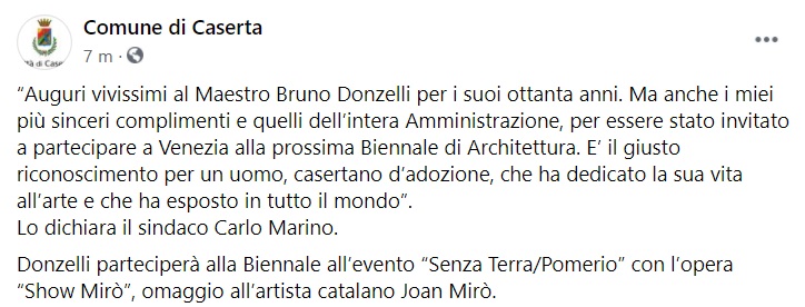 Questo quanto pubblicato sulla pagina fb del Comune di Caserta: "“Auguri vivissimi al Maestro Bruno Donzelli per i suoi ottanta anni. Ma anche i miei più sinceri complimenti e quelli dell’intera Amministrazione - si legge nella nota -, per essere stato invitato a partecipare a Venezia alla prossima Biennale di Architettura. E’ il giusto riconoscimento per un uomo, casertano d’adozione, che ha dedicato la sua vita all’arte e che ha esposto in tutto il mondo”. Lo dichiara il sindaco Carlo Marino. Donzelli parteciperà alla Biennale all’evento “Senza Terra/Pomerio” con l’opera “Show Mirò” - si legge nella nota -, omaggio all’artista catalano Joan Mirò."