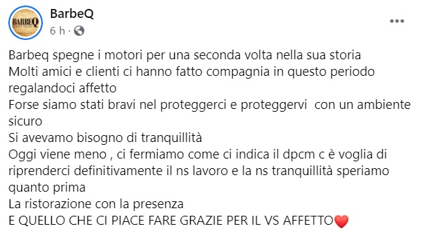 Questo quanto apprendiamo dalla pagina facebook di Barbeq: