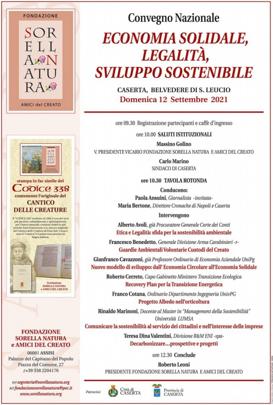 Pubblichiamo questa nota stampa: "“ECONOMIA SOLIDALE, LEGALITÀ, SVILUPPO SOSTENIBILE”, AL BELVEDERE DI SAN LEUCIO IL CONVEGNO NAZIONALE DELLA FONDAZIONE SORELLA NATURA DI ASSISI.