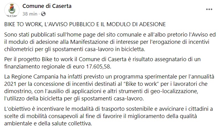Questo quanto apprendiamo dalla pagina fb del Comune di Caserta: "BIKE TO WORK, L'AVVISO PUBBLICO E IL MODULO DI ADESIONE