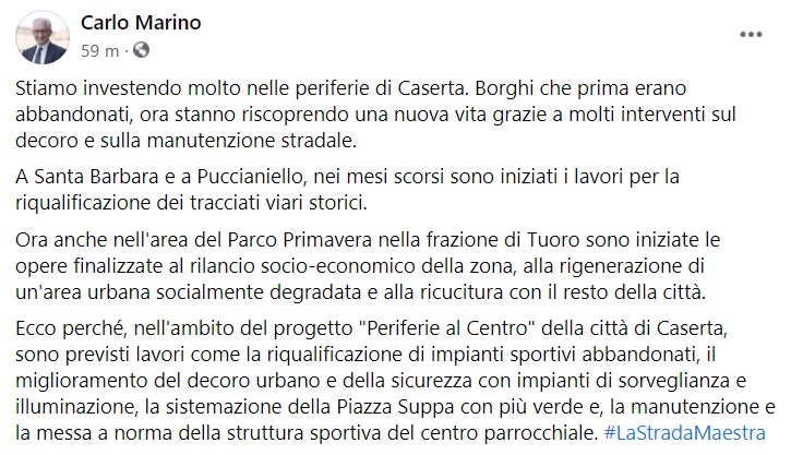 Questo quanto apprendiamo dalla pagina fb del Sindaco Marino: "Stiamo investendo molto nelle periferie di Caserta. Borghi che prima erano abbandonati, ora stanno riscoprendo una nuova vita grazie a molti interventi sul decoro e sulla manutenzione stradale. A Santa Barbara e a Puccianiello, nei mesi scorsi sono iniziati i lavori per la riqualificazione dei tracciati viari storici. Ora anche nell'area del Parco Primavera nella frazione di Tuoro sono iniziate le opere finalizzate al rilancio socio-economico della zona, alla rigenerazione di un'area urbana socialmente degradata e alla ricucitura con il resto della città. Ecco perché, nell'ambito del progetto "Periferie al Centro" della città di Caserta, sono previsti lavori come la riqualificazione di impianti sportivi abbandonati, il miglioramento del decoro urbano e della sicurezza con impianti di sorveglianza e illuminazione, la sistemazione della Piazza Suppa con più verde e, la manutenzione e la messa a norma della struttura sportiva del centro parrocchiale. La Strada Maestra"