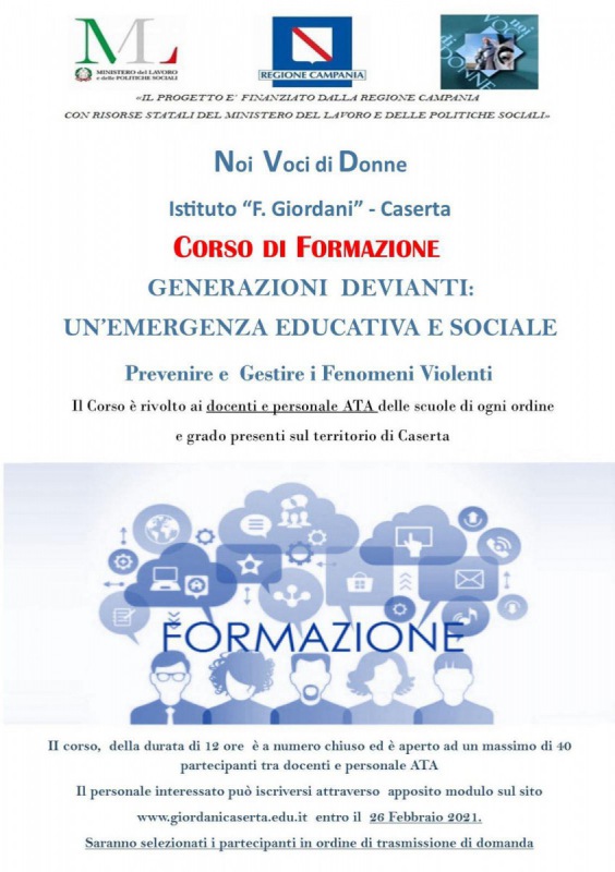 "Parte la seconda fase del progetto di Noi Voci di Donne “RICOMINCIO DA ME” in collaborazione con l’ITIS “Giordani” di Caserta, con il contributo della Regione Campania e del Ministero del Lavoro e delle Politiche Sociali. EDUCAZIONE, CONTRASTO e PREVENZIONE, sono questi i punti di forza delineati nelle attività di formazione - si legge nella nota - rivolte alla comunità educante. La Presidente di Noi Voci di Donne, dott.ssa Pina Farina: "stiamo lavorando per una crescita comune e sana che vede coinvolti diversi attori appartenenti ad ambiti diversi. Il nostro obbiettivo è quello di dare ai nostri giovani e al personale scolastico strumenti utili al contrasto della violenza di genere. Da anni lavoriamo anche a sostegno delle scuole attraverso workshop e corsi formazione sui fenomeni violenti e le devianze che investono molto spesso i nostri giovani. La rete dei partecipante a questo progetto - si legge nella nota -, è una rete solida e compatta che da tempo collabora con la nostra organizzazione in attività di prevenzione e di sensibilizzazione. Per le iscrizione dall’8 al 26 febbraio sul sito www.giordanicaserta.edu.it”